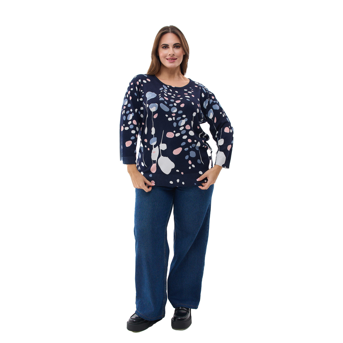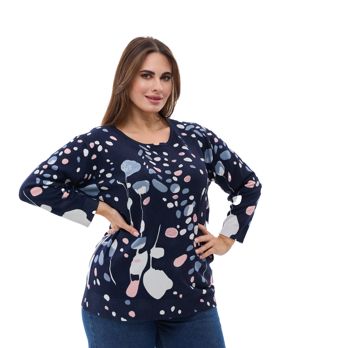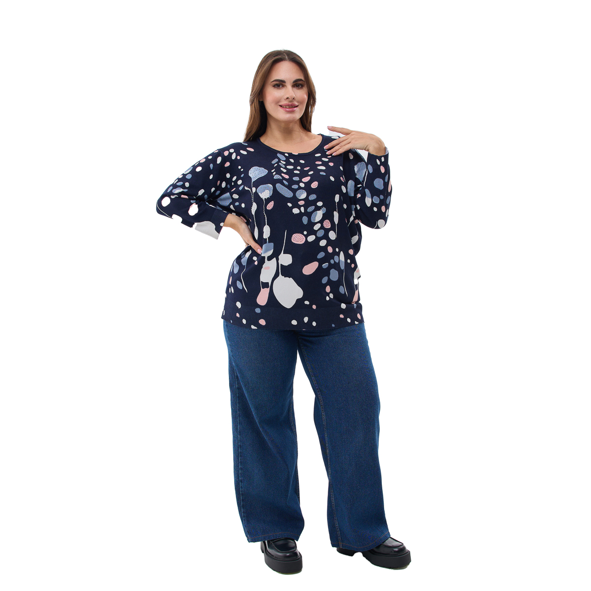Комфортний крій: Напівприлеглий силует підкреслює фігуру, не обмежуючи рухів. Джемпер ідеально сидить на будь-якому типі статури.