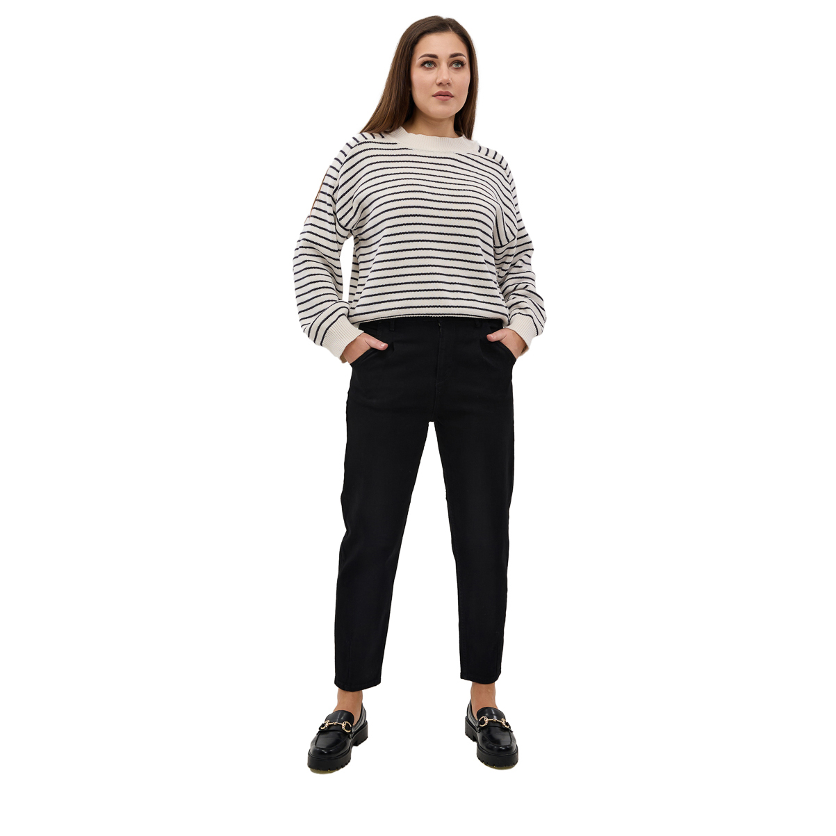 Вибирайте з двох модних варіантів: класичні мом і мом з виточкою. Палітра забарвлень включає сині, сірі та чорні джинси - базові кольори, які підійдуть до будь-якого образу. Висока посадка підкреслить лінію талії, створюючи витончений і стрункий силует, а зручні об'ємні кишені додадуть практичності.