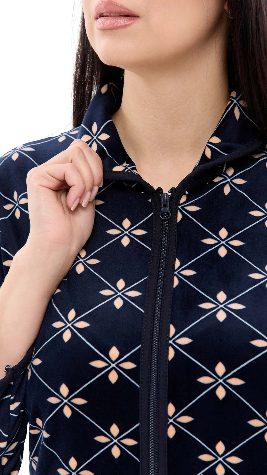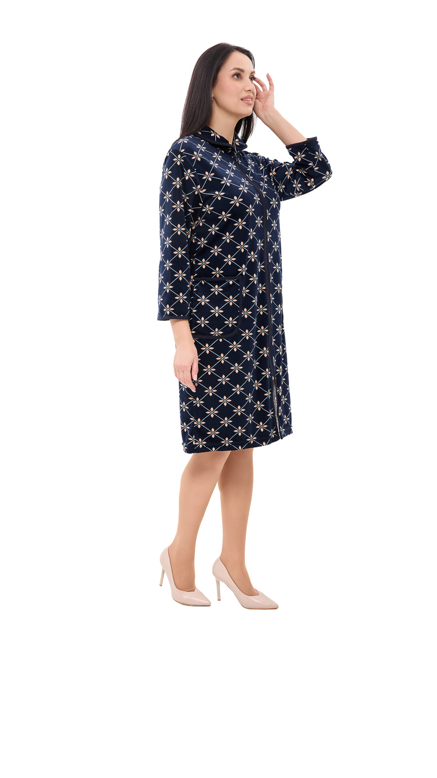 Ніжність Велюру! Цей халат створений для домашнього затишку та ідеальний для подорожей завдяки своїй зручності. Він виготовлений з м'якого велюру, який зберігає приємну температуру тіла, не займаючи багато місця в багажі. Простий крій та блискавка на всю довжину забезпечують легкість та свободу рухів, а накладні кишені роблять халат ще більш функціональним, дозволяючи зберігати дрібниці, які завжди потрібні під рукою.. Велюрова тканина цінується за свою зносостійкість та зручність в експлуатації. Одяг з велюру притягує своєю бархатистою текстурою, відмінно абсорбує вологу, забезпечує тепло та комфорт шкірі.