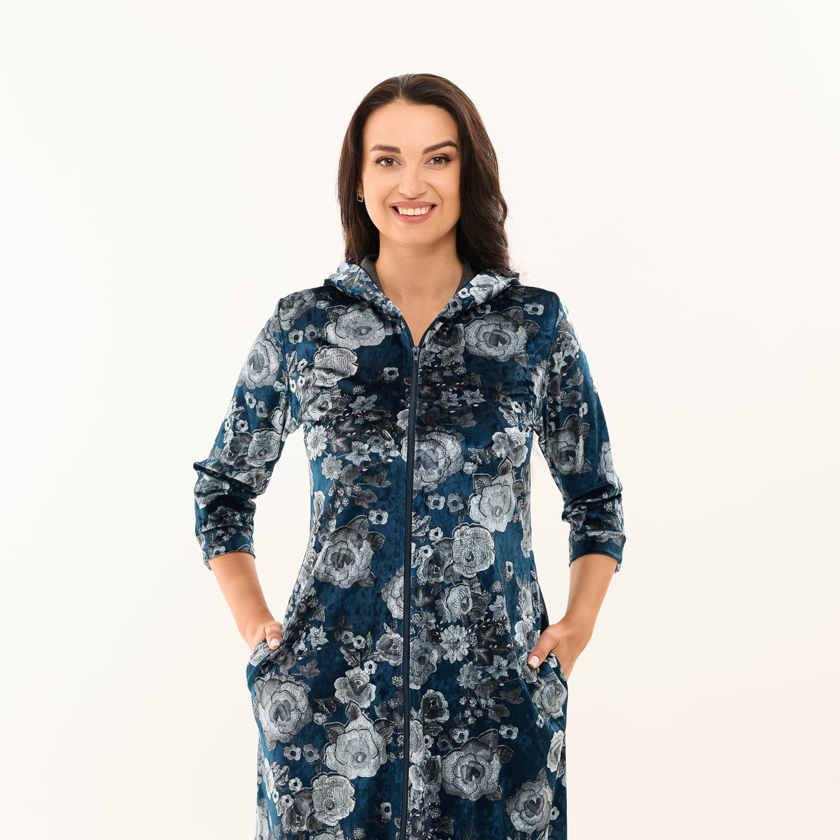 Крій - Халат велюровий на блискавці з капюшоном і двома бічними кишенями