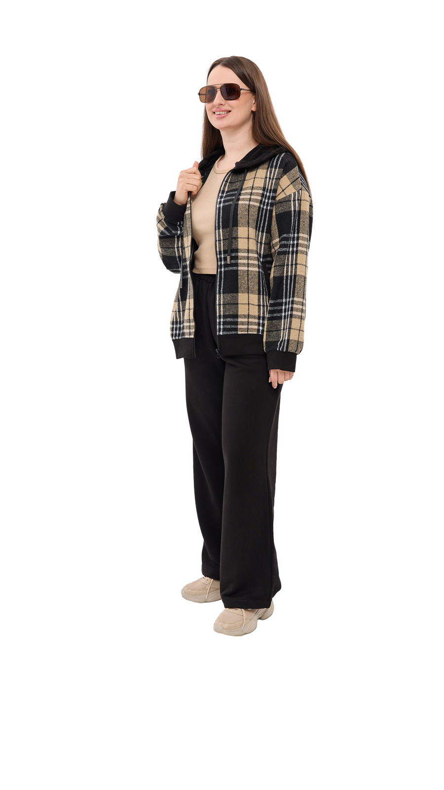 Костюм Мелісса у клітинку з капюшоном — стильний і дуже комфортний варіант на щодень, коли хочеться виглядати зібрано, але почуватися максимально вільно. Верх виконаний у форматі м’якої сорочки-кофти на блискавці з капюшоном та двома зручними боковими кишенями — ідеально, щоб зігріти руки або взяти з собою дрібниці. Тканина приємна на дотик, добре лягає по фігурі й створює акуратний силует. Штани — прямого брючного крою на резинці, з легким звуженням донизу, завдяки чому образ виглядає сучасно й охайно. Комплект легко комбінується з базовими футболками/топами та кросівками, підходить для прогулянок, поїздок, роботи в casual-стилі чи затишних вихідних.