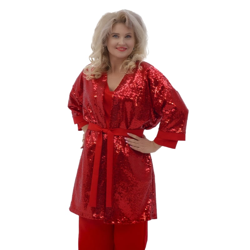 Шукаєте костюм, який ідеально поєднує в собі елегантність, комфорт та стиль, при цьому не вимагаючи великих витрат? Розпакуй TV пропонує вам відмінне рішення – Костюм Сяйво! Цей костюм не тільки зручний, але й виглядає розкішно завдяки поєднанню блузи та штанів прямого крою з вишуканим кардиганом-накидкою на поясі. Його елегантний дизайн з паєтками на кардигані та лаконічність однотонних штанів та блузи додадуть вишуканості вашому образу.