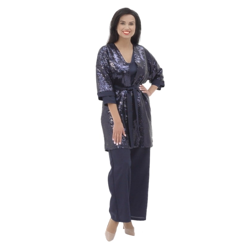 Шукаєте костюм, який ідеально поєднує в собі елегантність, комфорт та стиль, при цьому не вимагаючи великих витрат? Розпакуй TV пропонує вам відмінне рішення – Костюм Сяйво! Цей костюм не тільки зручний, але й виглядає розкішно завдяки поєднанню блузи та штанів прямого крою з вишуканим кардиганом-накидкою на поясі. Його елегантний дизайн з паєтками на кардигані та лаконічність однотонних штанів та блузи додадуть вишуканості вашому образу.