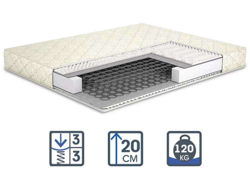Матрац Бум-3 купити в інтернет-магазині Матрац ТБ можна не виходячи з дому. Оригінальний виріб від МатроЛюкс має в основі блок сталевих пружин Bonnel. Конструкція посилена євробортом. Обидві сторони рівнозначні за функціоналом, мають універсальну середню жорсткість.