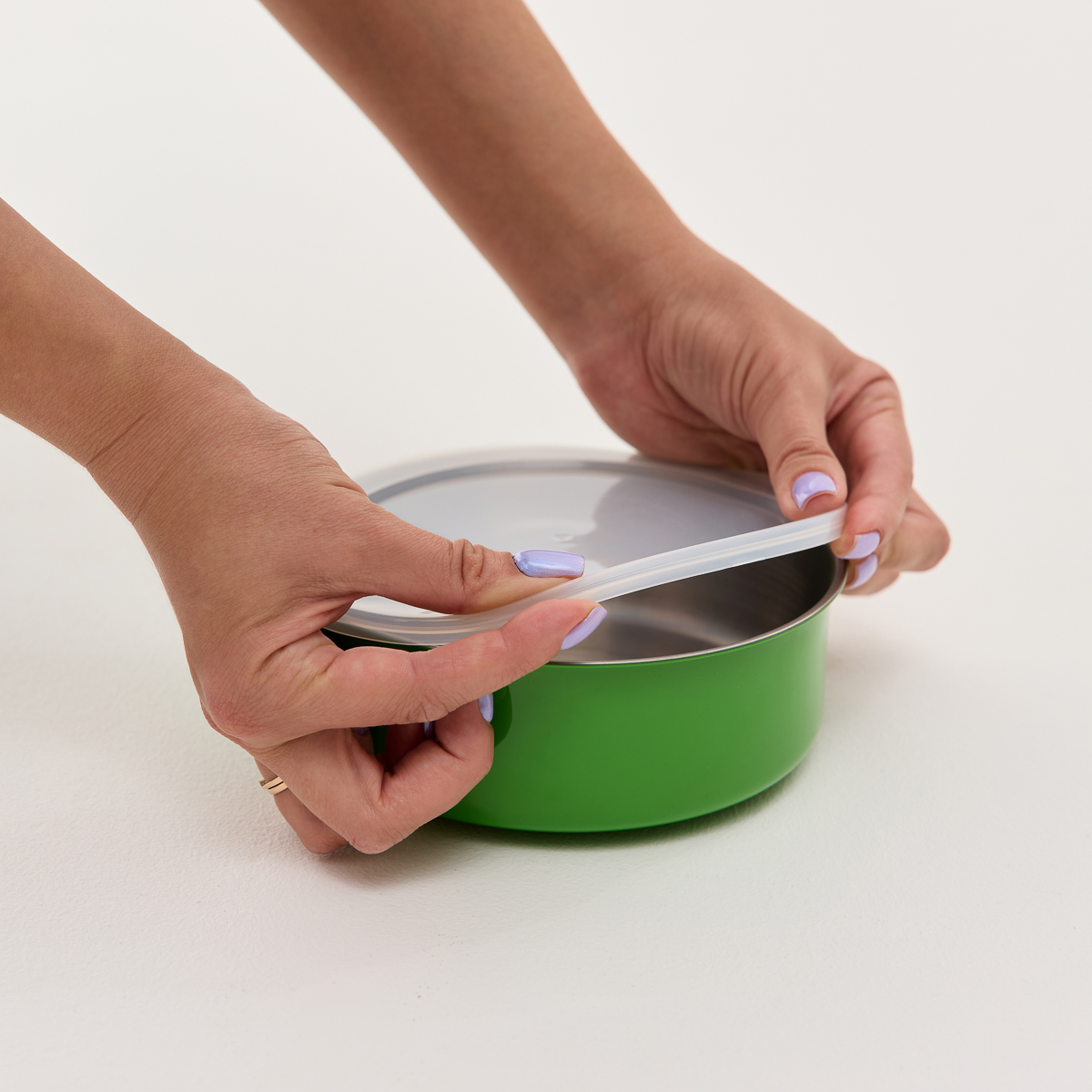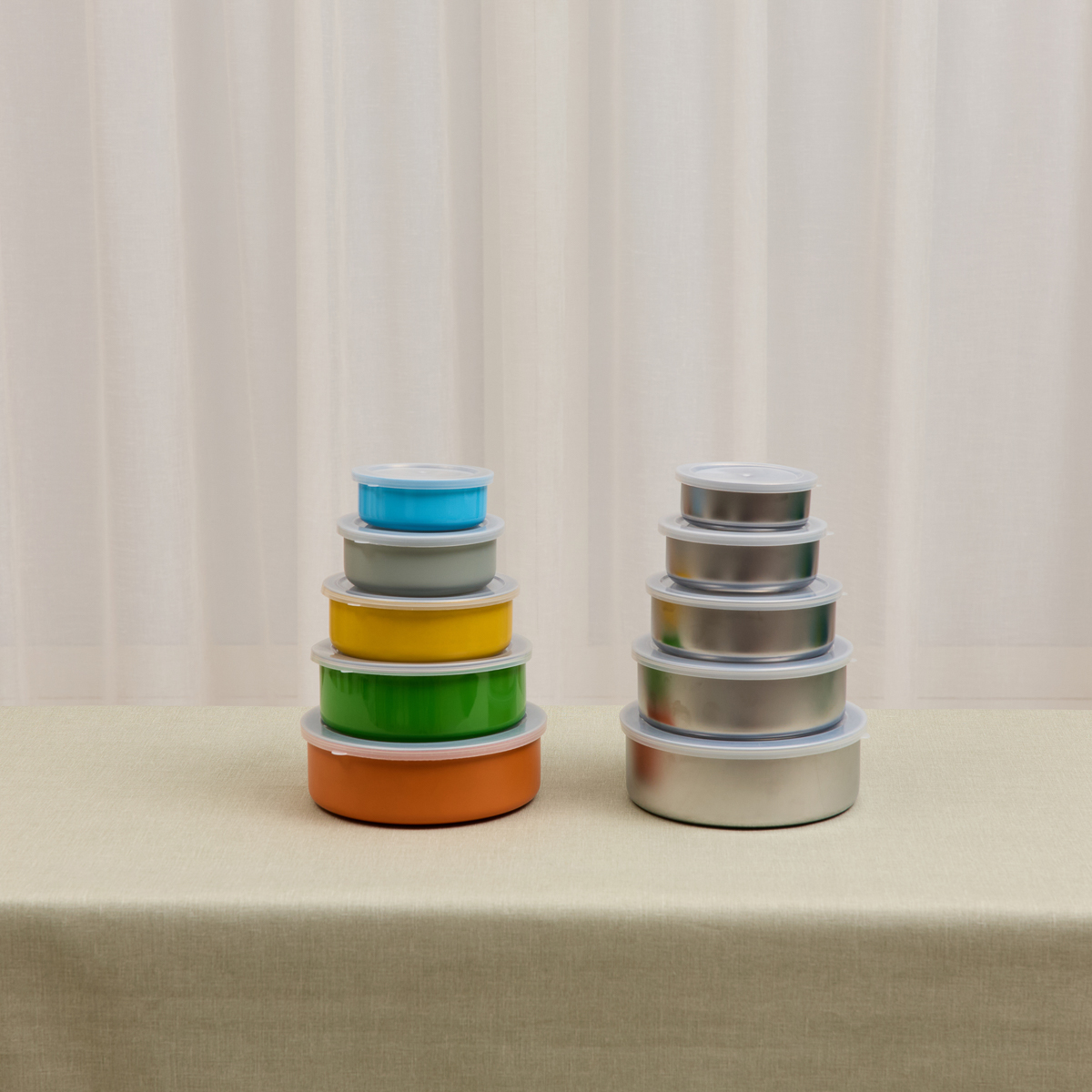Короткий опис товару – набір складається з 5 круглих харчових контейнерів, виготовлених із нержавіючої сталі з пластиковими кришками. Матеріали безпечні для здоров’я, не змінюють смак і запах їжі, легко миються та мають привабливий вигляд. Підходять для зберігання різноманітних продуктів (овочів, фруктів, цукерок, печива), а також для зберігання та транспортування готових страв.