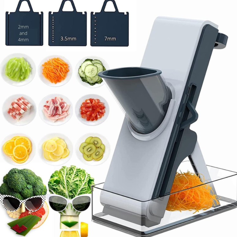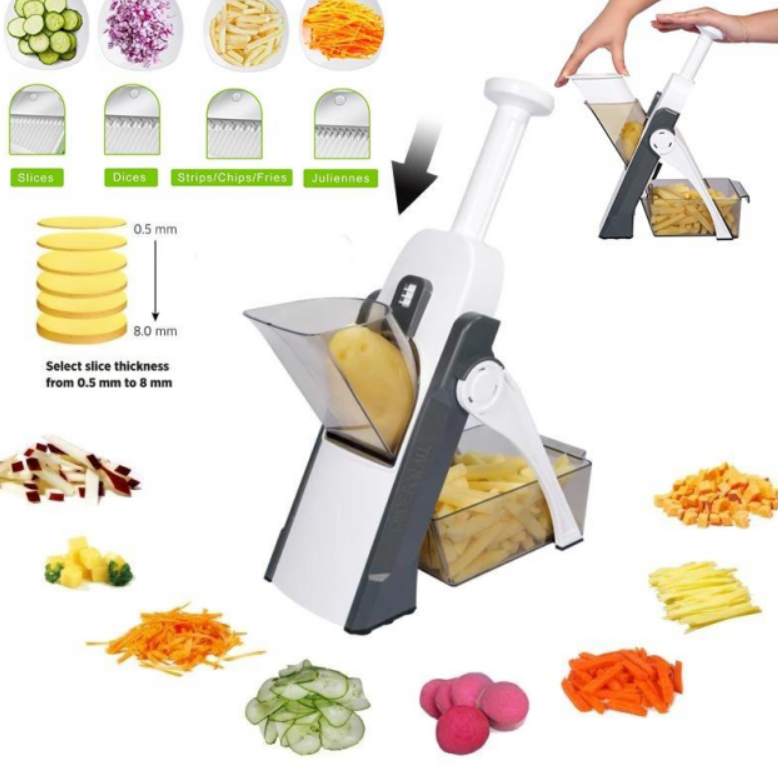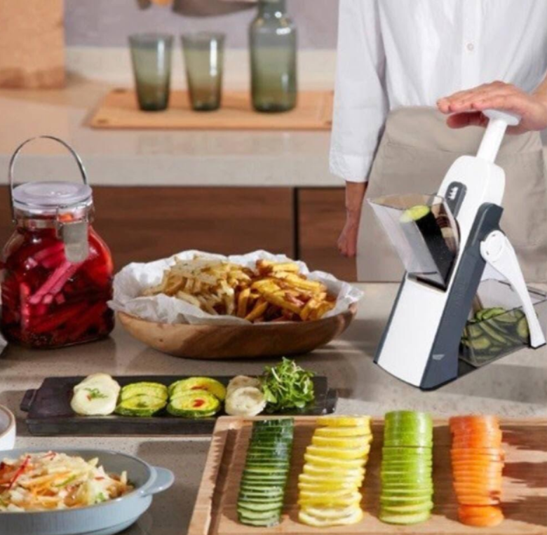 Мультислайсеру до снаги порізати овочі та фрукти кубиками, кружечками, соломкою, брусочками різної товщини та довжини. Мультислайсер є багатофункціональним напівавтоматичним пристроєм із вбудованою системою лез із неіржавіючої сталі для нарізання найрізноманітніших овочів і фруктів.