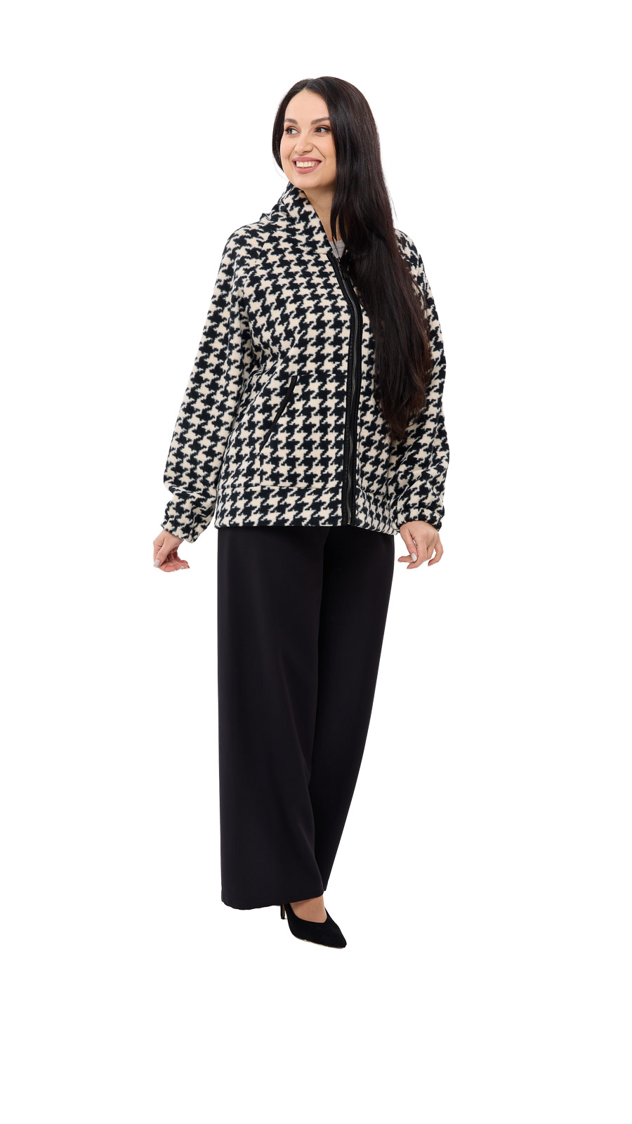 Доступні кольори — чорно-білий, зелений і мокко — дозволяють підібрати варіант під настрій і стиль. Класичний візерунок «гусячі лапки» додає образу інтелігентної елегантності, а укорочений крій робить модель більш динамічною та сучасною. Розмірний ряд 48–58 забезпечує комфортну посадку та чудово підходить для різних типів фігури. Пальто гарно сідає як із класичними брюками, так і з укороченими моделями або брюками 7/8, створюючи гармонійний і стильний силует. Його легко поєднувати з ботильйонами, чоботами чи лоферами — образ завжди виглядатиме завершеним.Сезон - демісезонний, зимовий
