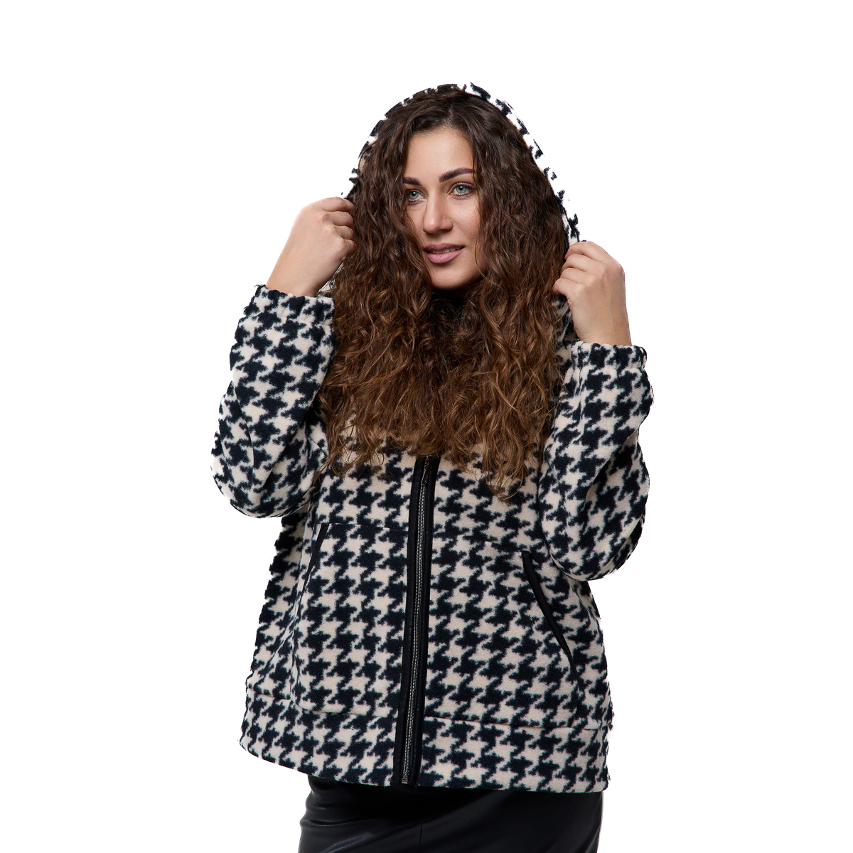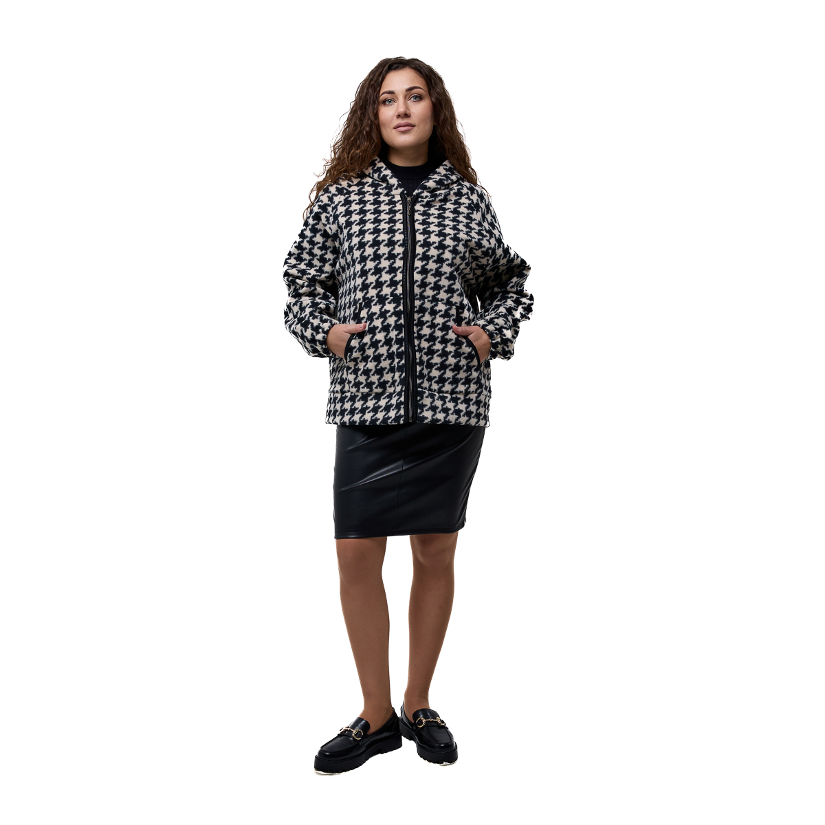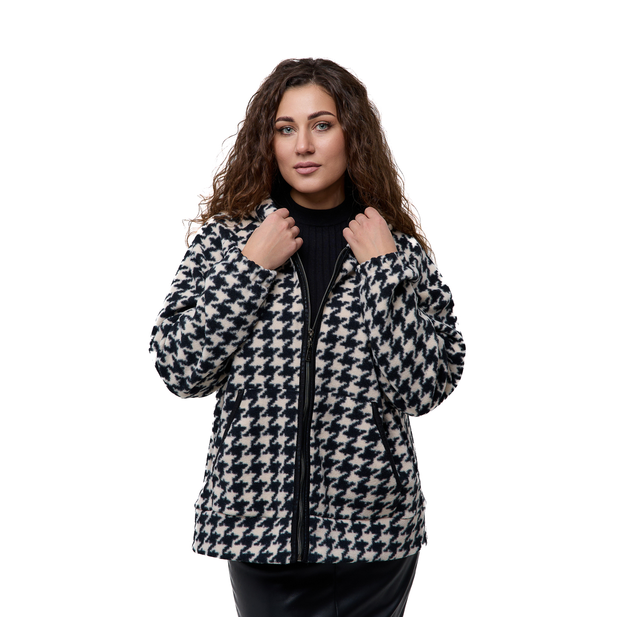 Доступні кольори — чорно-білий, зелений і мокко — дозволяють підібрати варіант під настрій і стиль. Класичний візерунок «гусячі лапки» додає образу інтелігентної елегантності, а укорочений крій робить модель більш динамічною та сучасною. Розмірний ряд 48–58 забезпечує комфортну посадку та чудово підходить для різних типів фігури. Пальто гарно сідає як із класичними брюками, так і з укороченими моделями або брюками 7/8, створюючи гармонійний і стильний силует. Його легко поєднувати з ботильйонами, чоботами чи лоферами — образ завжди виглядатиме завершеним.Сезон - демісезонний, зимовий