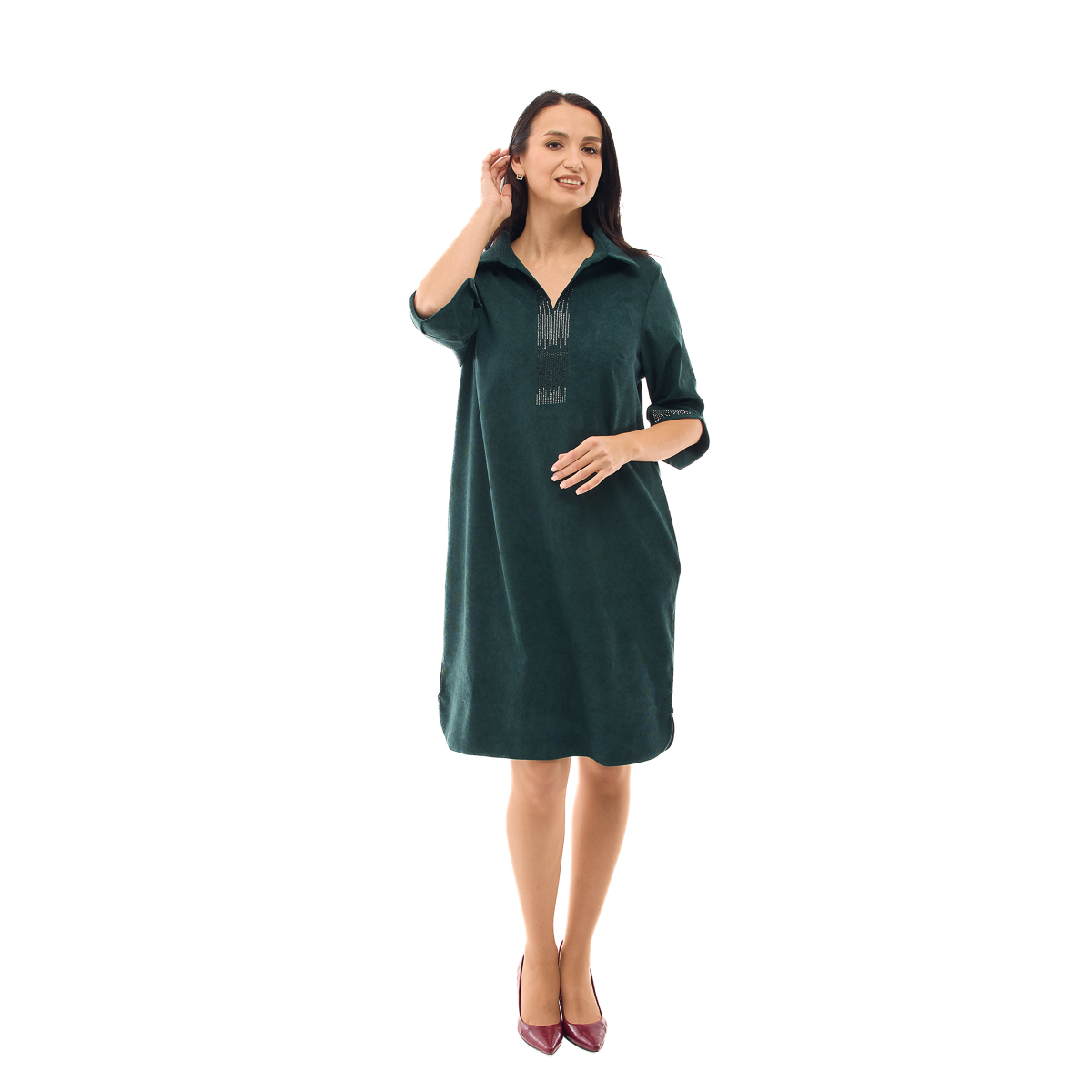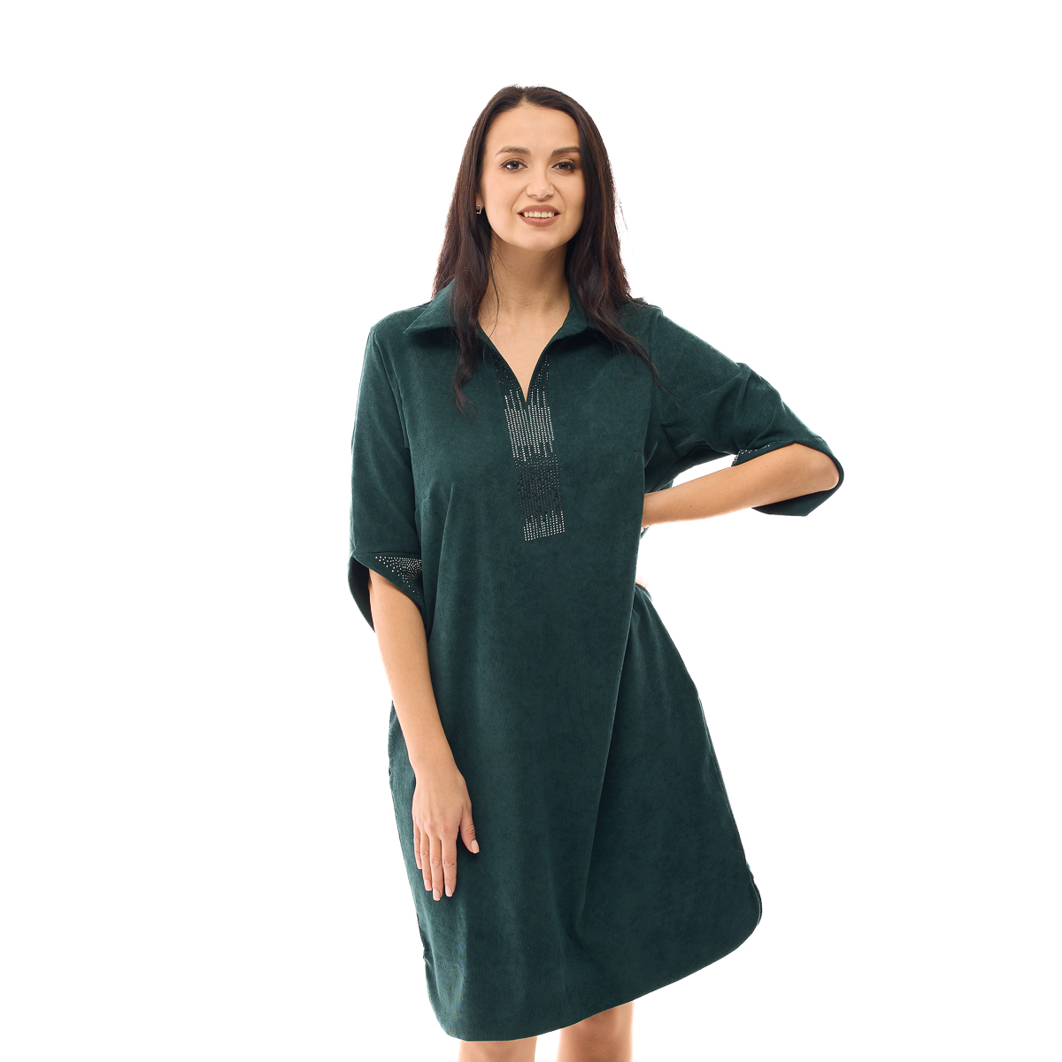 Сукня Міріада має універсальний крій, який ідеально пасує будь-якому типу фігури. Відкладний комір візуально подовжує шию. Декор зі стразів допоможе Вам залишити незабутнє враження як в святкові, так і в повсякденні дні.