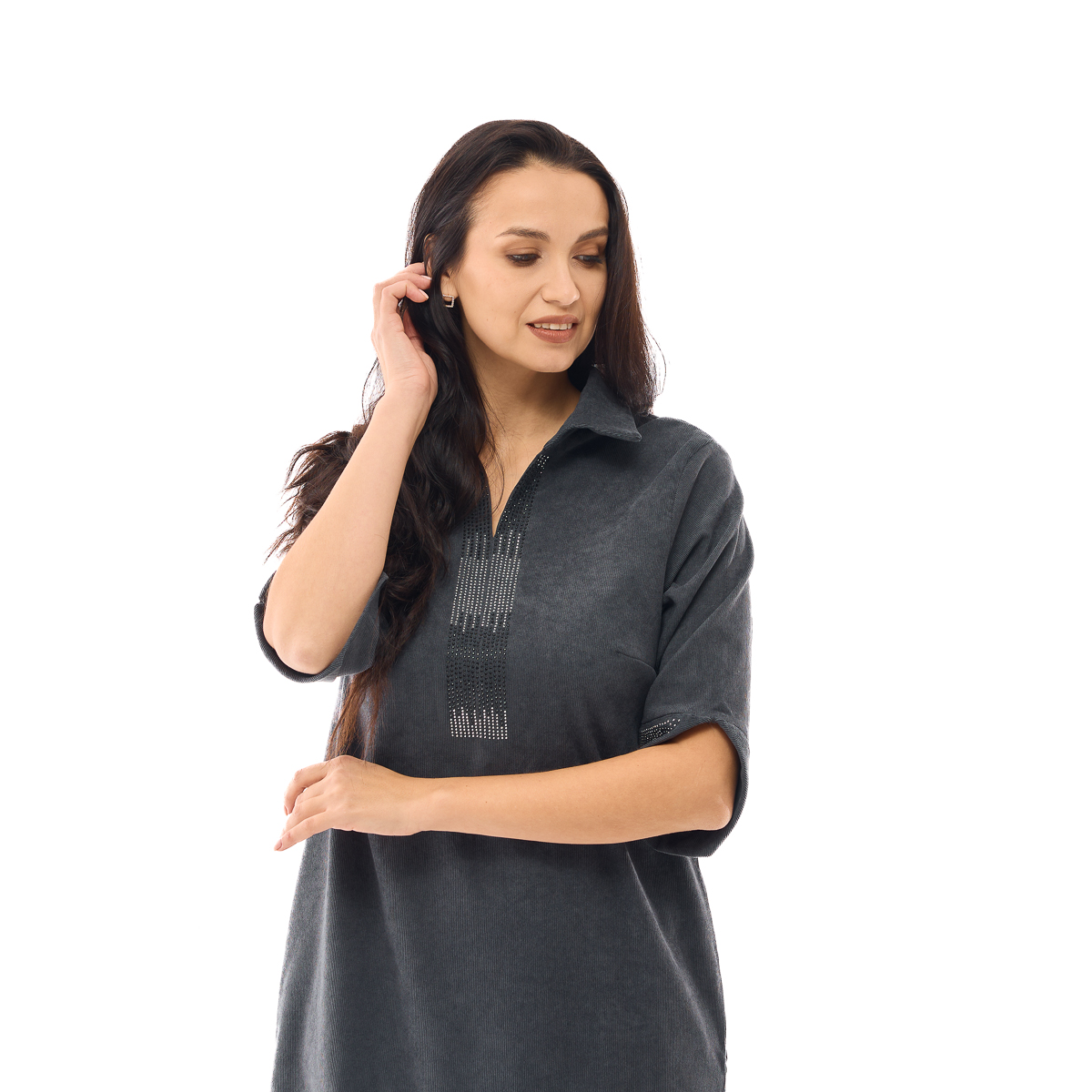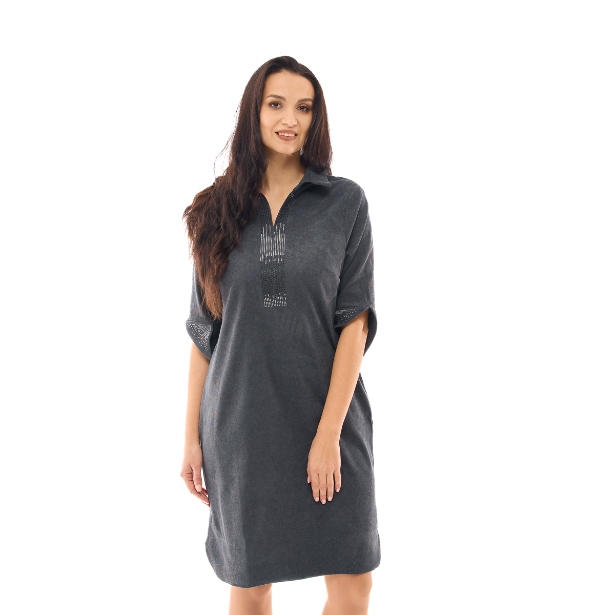 Сукня Міріада має універсальний крій, який ідеально пасує будь-якому типу фігури. Відкладний комір візуально подовжує шию. Декор зі стразів допоможе Вам залишити незабутнє враження як в святкові, так і в повсякденні дні.