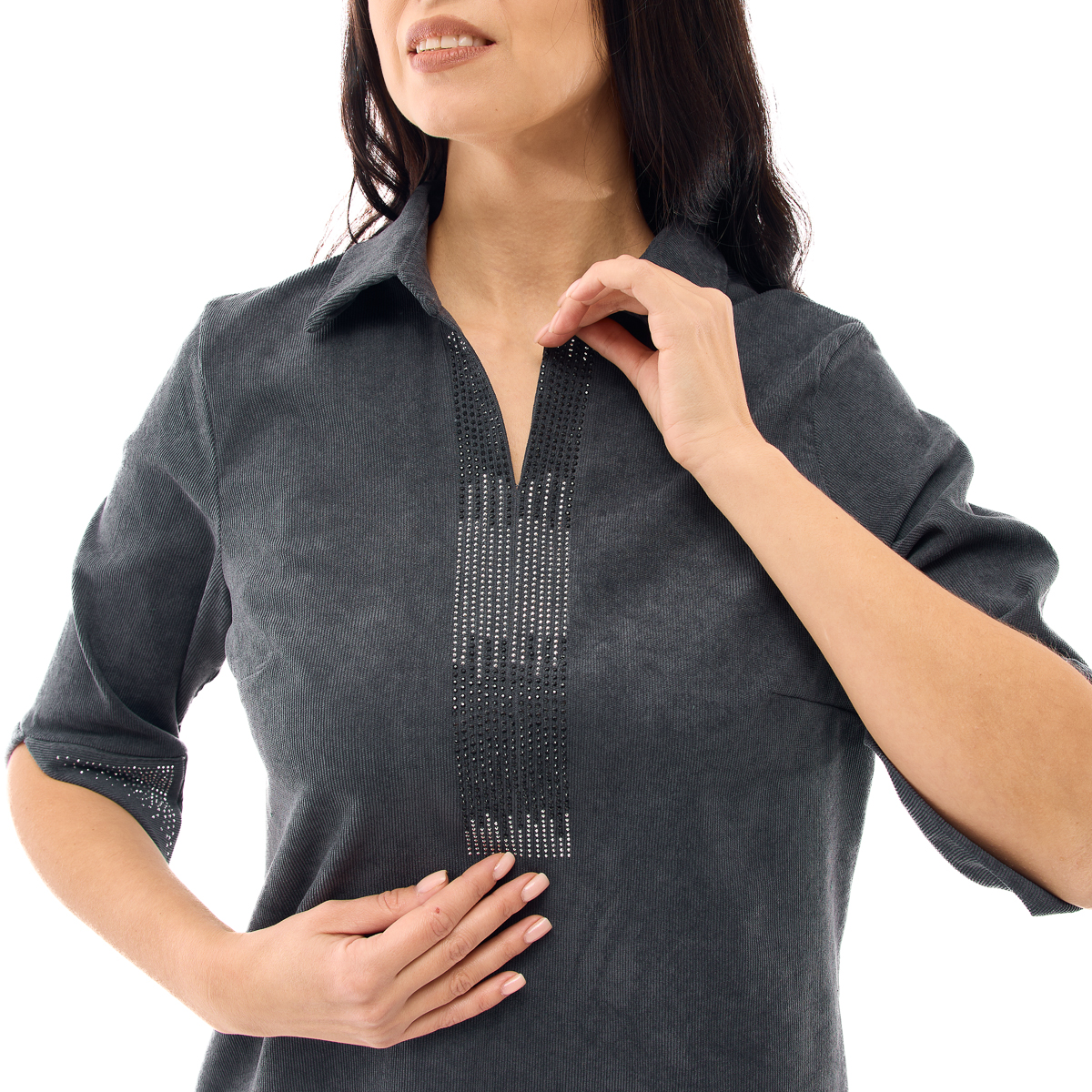 Сукня Міріада має універсальний крій, який ідеально пасує будь-якому типу фігури. Відкладний комір візуально подовжує шию. Декор зі стразів допоможе Вам залишити незабутнє враження як в святкові, так і в повсякденні дні.