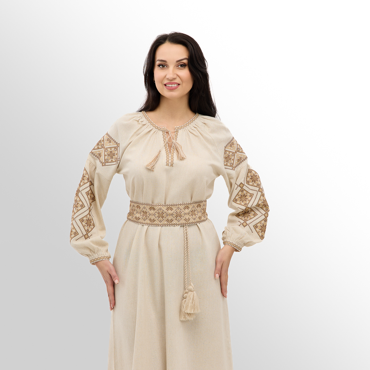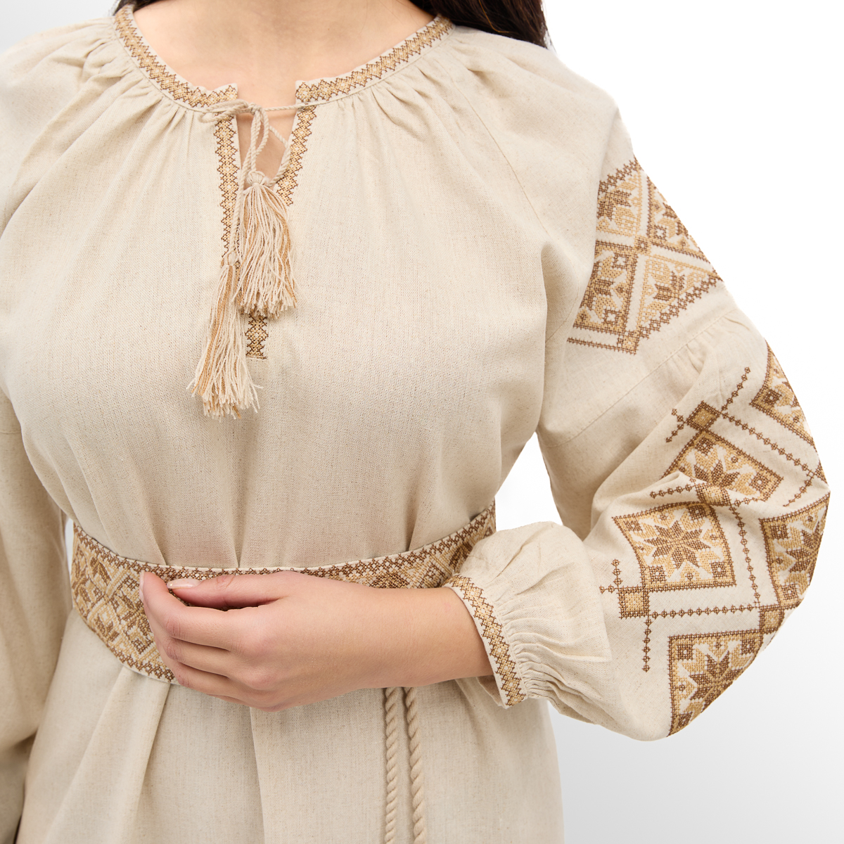 Сукня «Роксолана» представлена у двох варіантах довжини - міді та максі, що дає змогу підібрати модель під свій стиль і особливості фігури. Прямий крій з поясом підкреслює талію і створює витончений силует. Широкі рукави додають легкості та романтичності, а контрастна вишивка робить сукню яскравим акцентом у будь-якому образі. Матеріал сукні - це легка і дихаюча тканина, яка забезпечує комфорт навіть у спекотну погоду. Завдяки своїй структурі матеріал м'яко прилягає до тіла, не сковує рухів і дарує відчуття свободи. Сукня «Роксолана» - це ідеальний вибір для тих, хто цінує стиль, комфорт та етнічні мотиви в одязі!