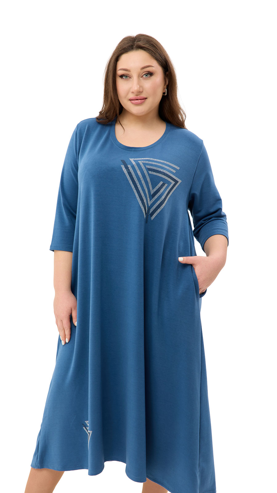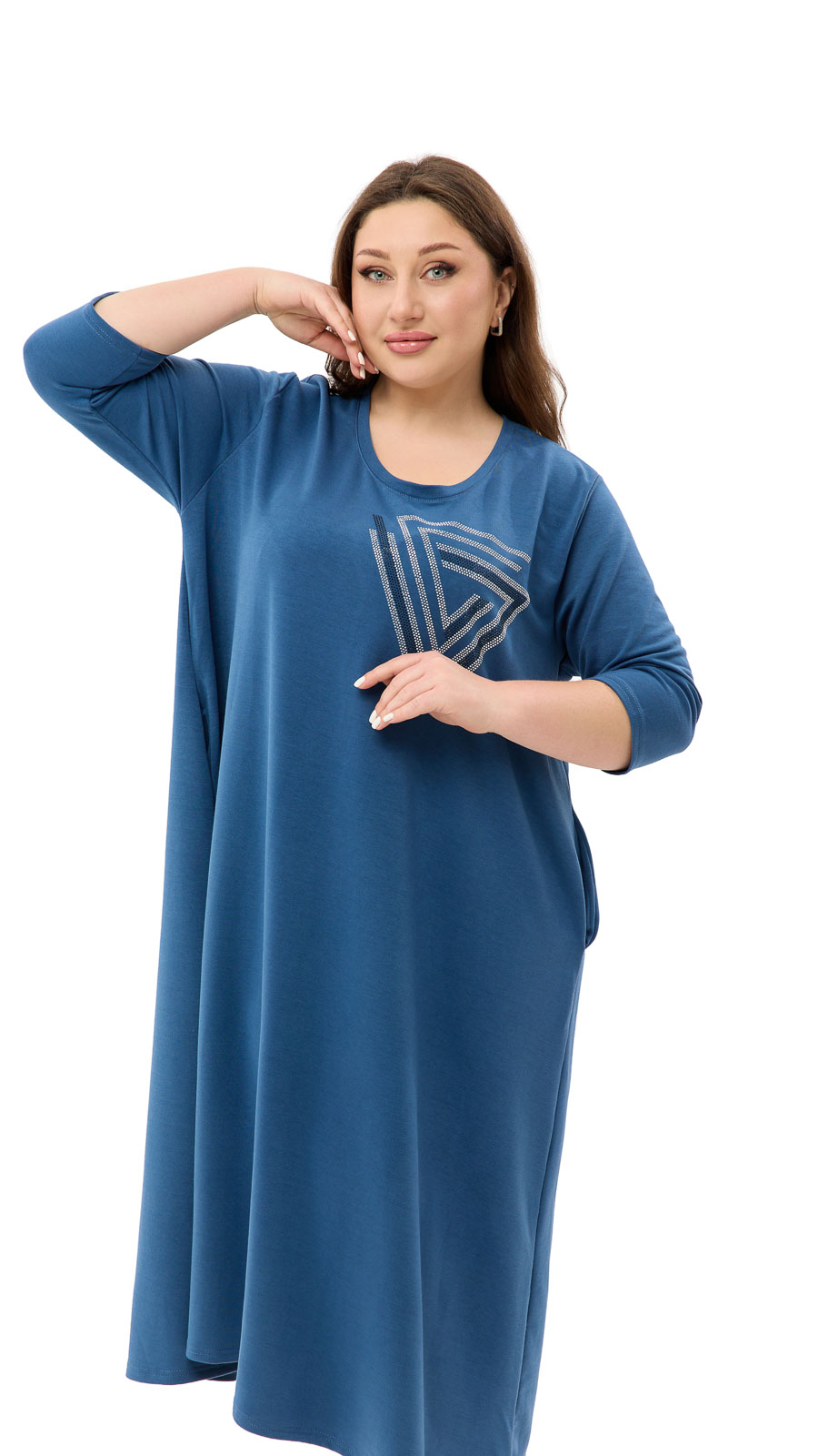 Стильний принт зі стразами додає образу виразності та блиску, роблячи сукню не тільки зручною, а й елегантною.