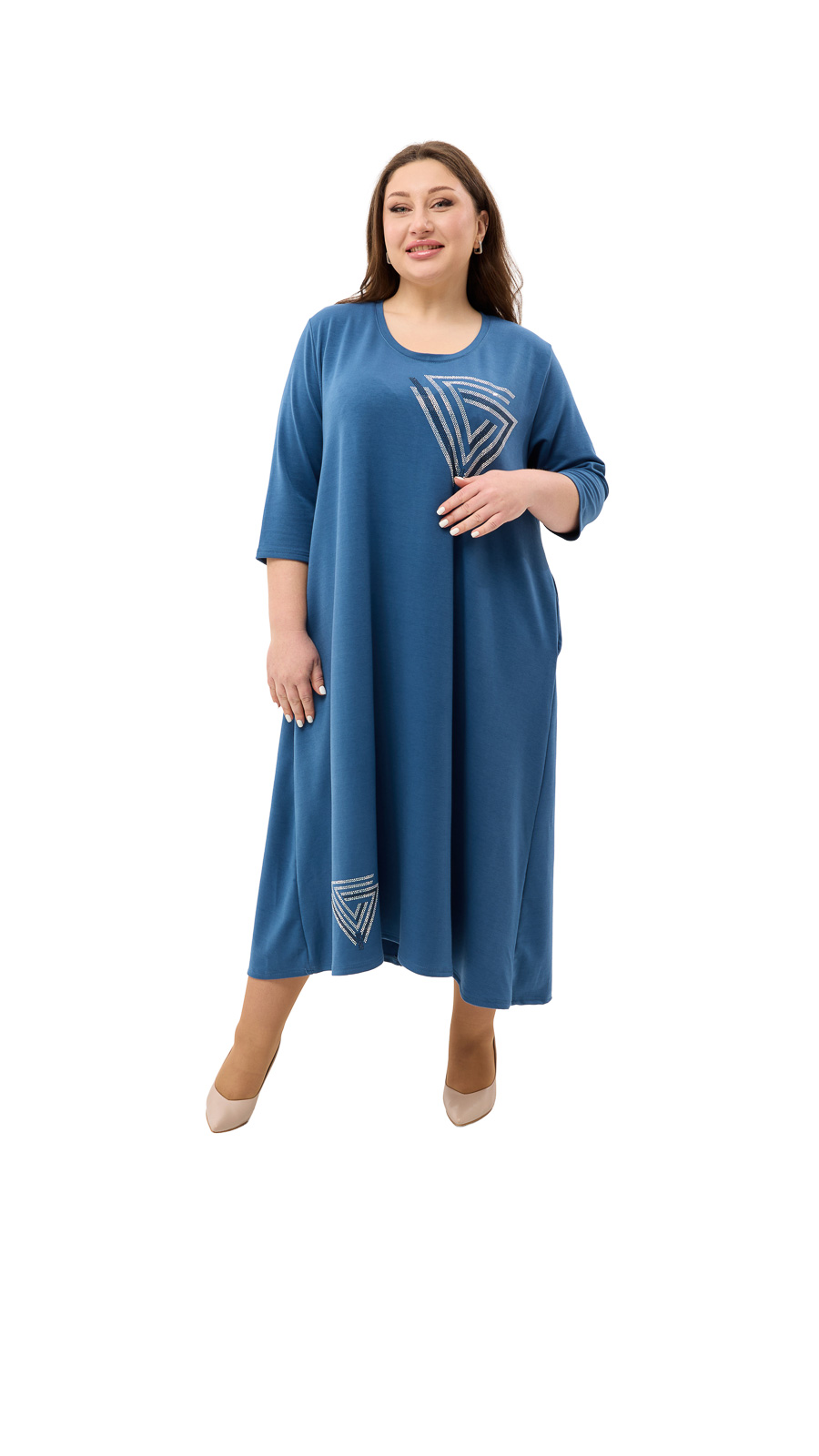 Стильний принт зі стразами додає образу виразності та блиску, роблячи сукню не тільки зручною, а й елегантною.