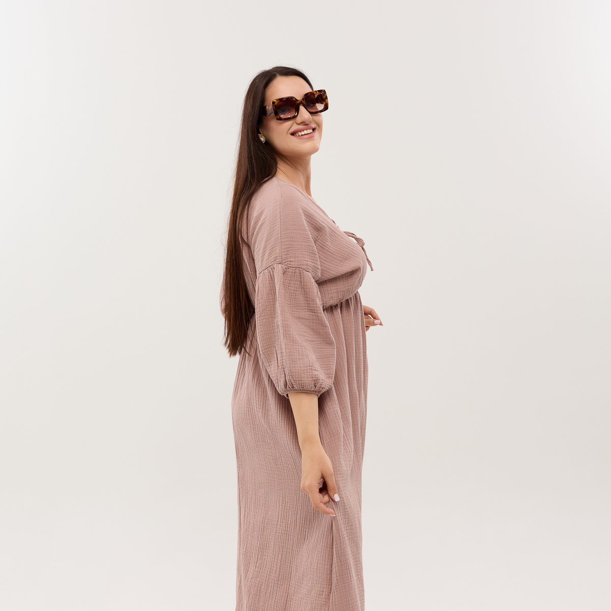Сукня Саванна — це ідеальний вибір для тих, хто цінує поєднання легкості, натуральності й стилю. Вільний крій дарує відчуття простору та комфорту, створюючи витончений силует, який пасує жінкам із різними типами фігур. Виготовлена з натурального мусліну — дихаючої, м’якої на дотик тканини, що ніжно огортає тіло та забезпечує комфорт навіть у найспекотніші дні.