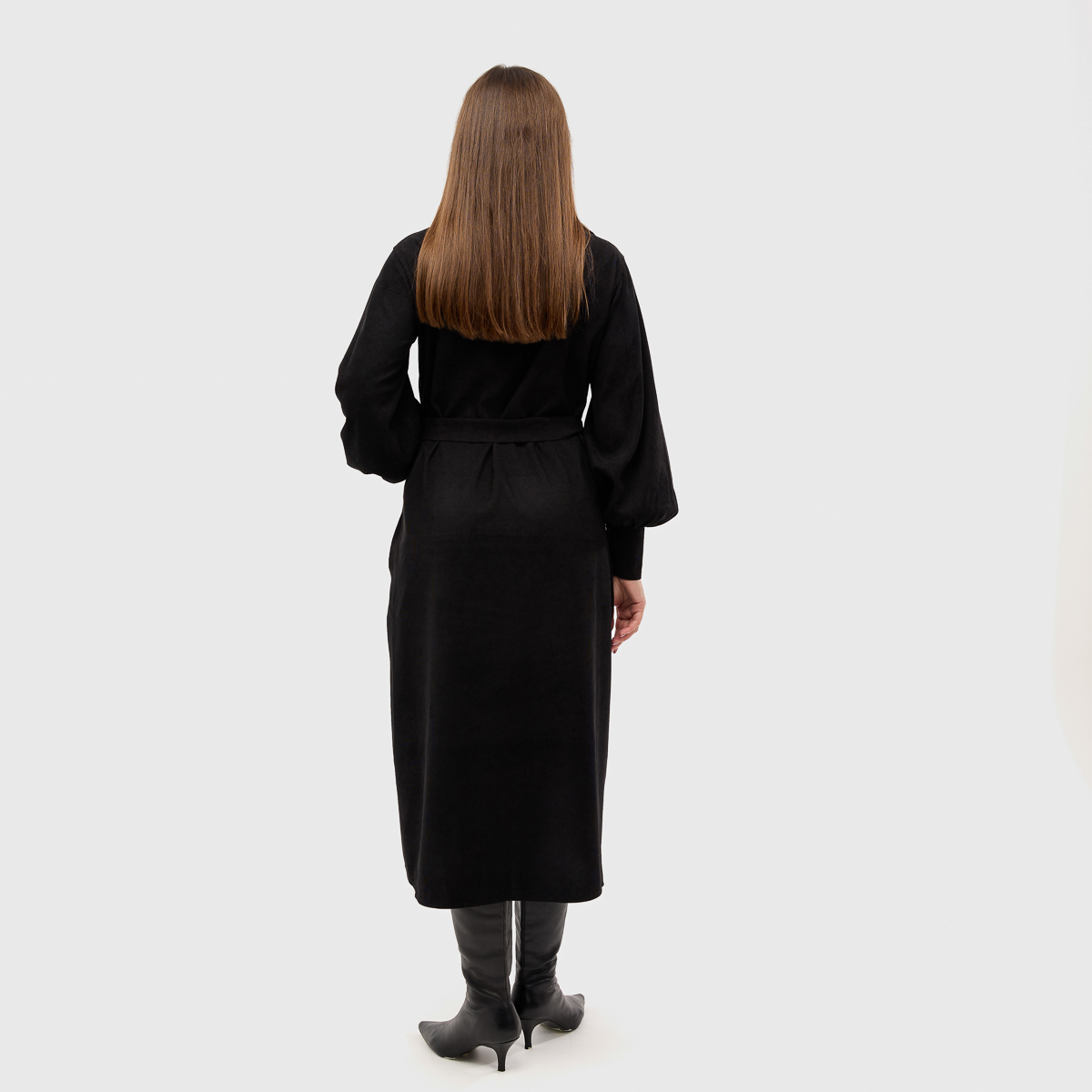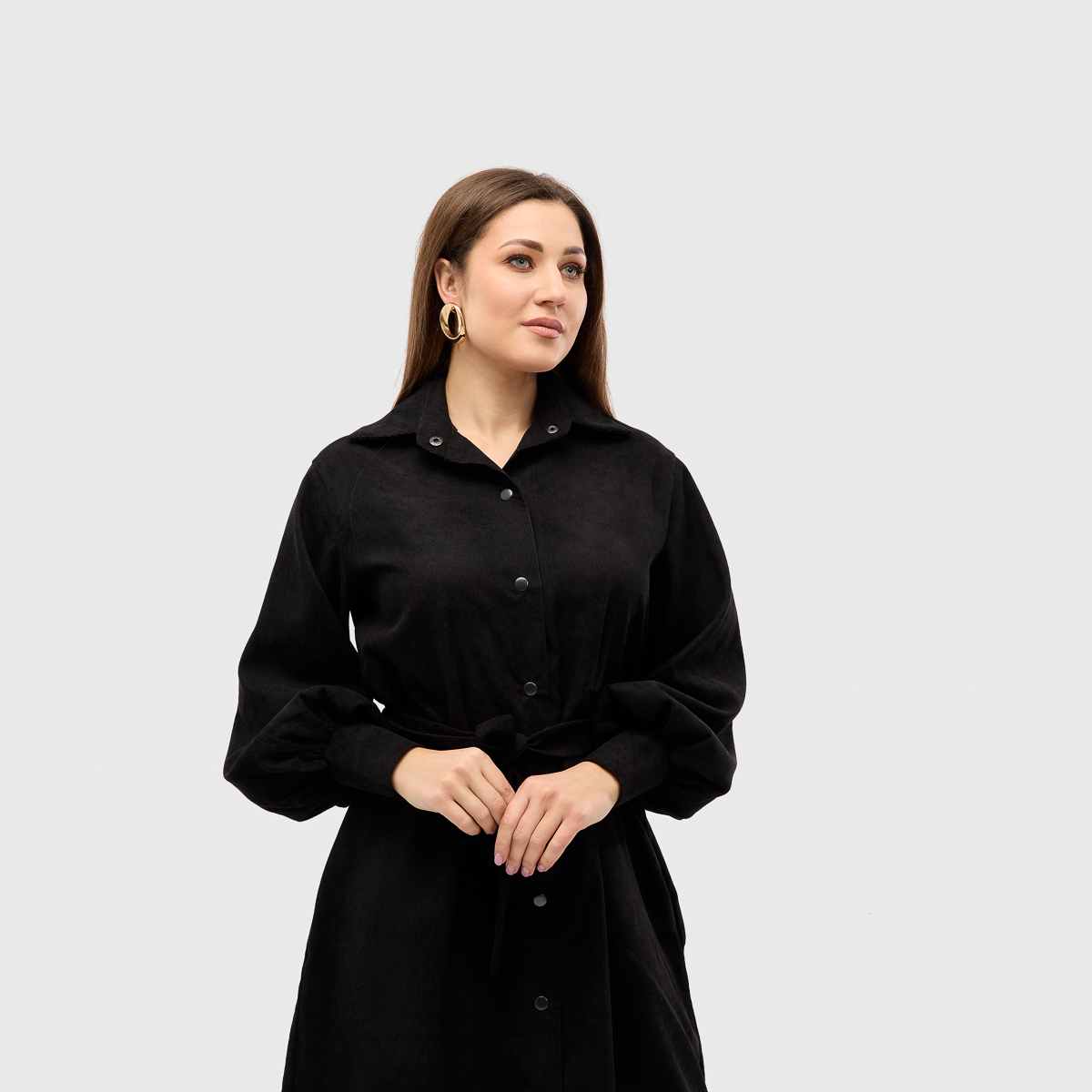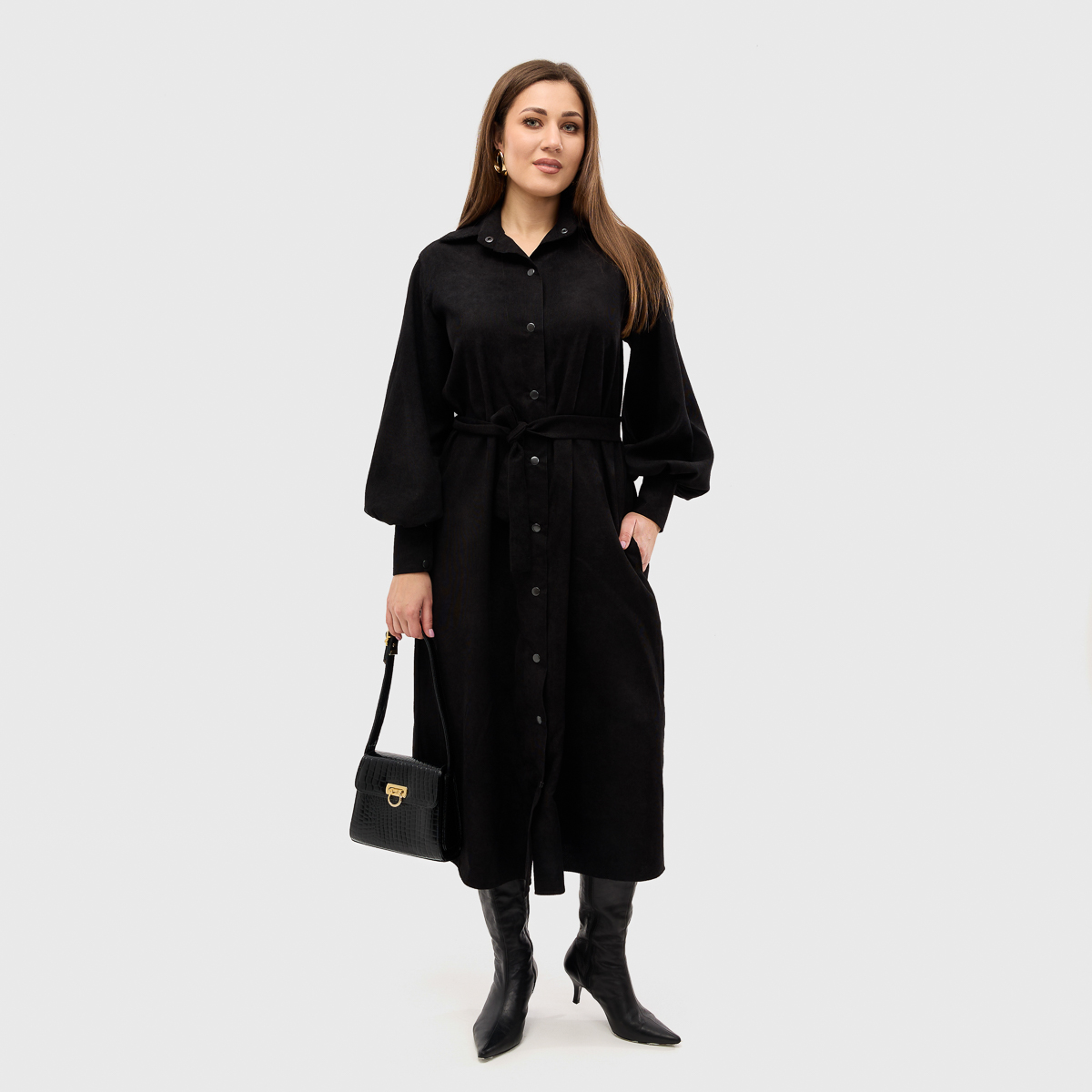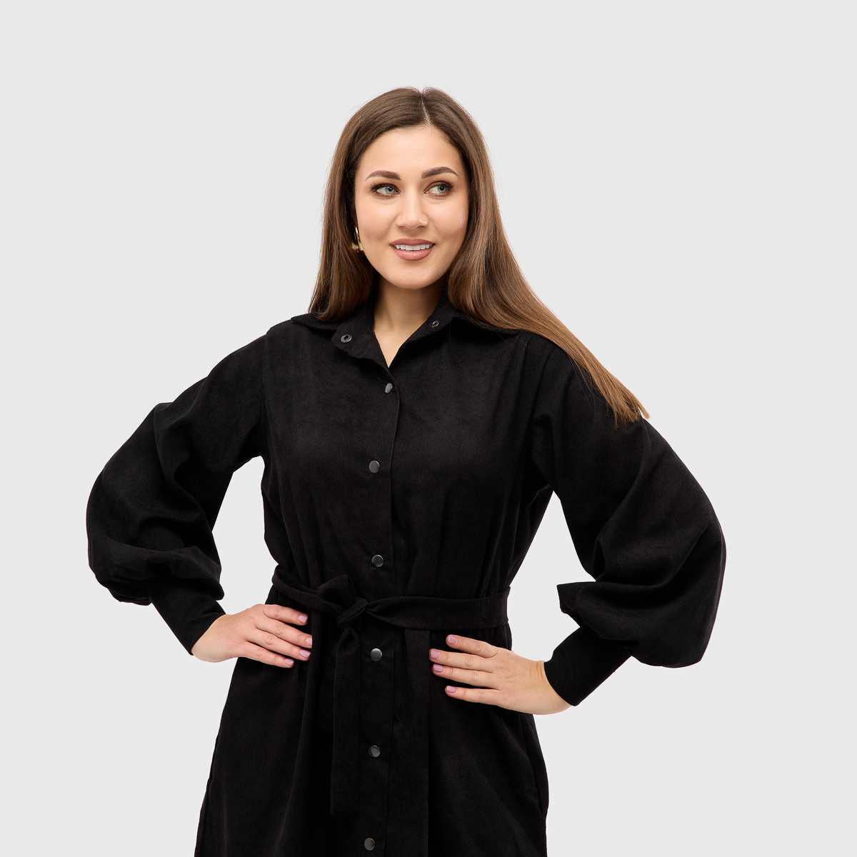 Ідеальне поєднання класики та сучасних деталей. Сукня виконана з класичним коміром, манжетами на рукавах і застібками-кнопками, які роблять образ елегантним і стильним. Наявність пояса підкреслює талію, створюючи жіночний силует.