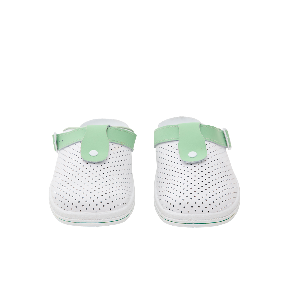 Сабо Симона – це елегантний європейський стиль, якісна італійська шкіра та невимовний комфорт анатомічної устілки! Рідкісне поєднання краси та зручності! Сабо чудово поєднується як з елегантним, так і з повсякденним одягом! Просто вибирайте класичний білий колір або родзинку у вигляді смарагдового декору!