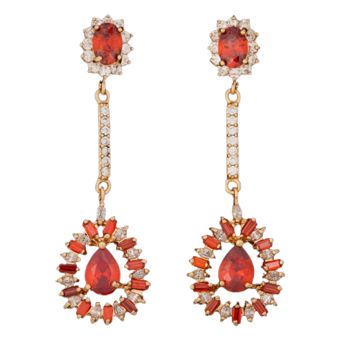 Сережки прикрашені діамантами кольору спілого граната, огранка "Крапля", в обрамленні прозорих кристалів. Вони вільно висять і грають у русі, додаючи вишуканості вашому образу.