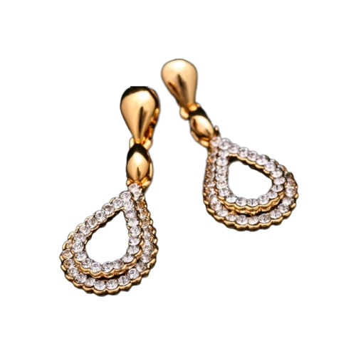 Сережки виконані з 18-каратним золотим покриттям та прикрашені білими стразами, що надає їм неповторний блиск та шик. Вони ідеально підійдуть для урочистих заходів та вечірніх виходів.