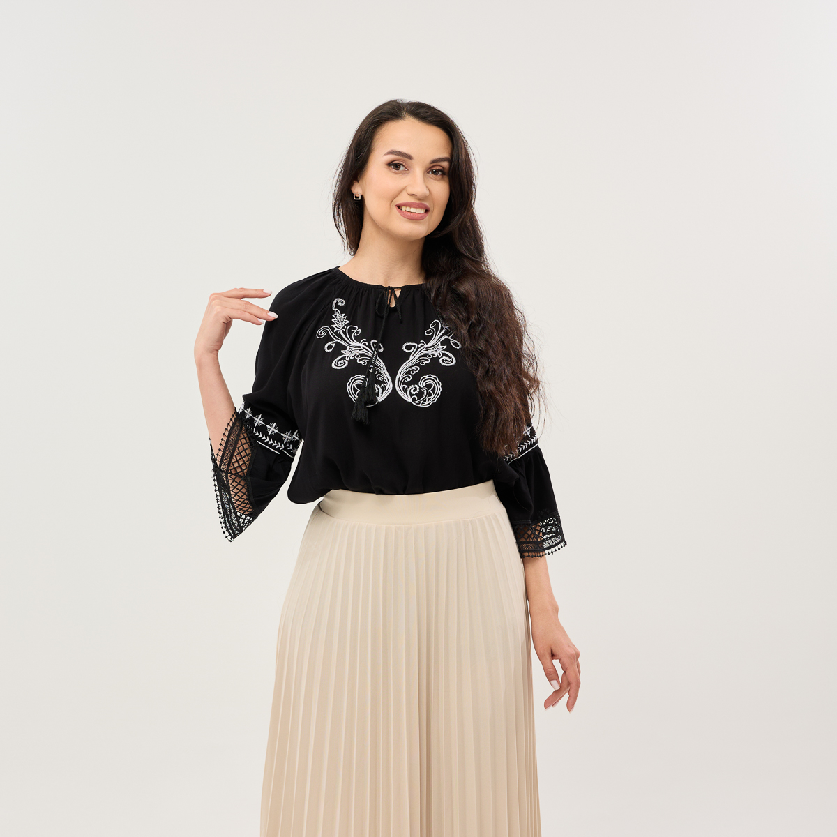 Прямий крій і довжина до середини стегна створюють зручний та вільний силует, що пасує різним типам фігури. Особливу увагу привертає витончений етнічний дизайн: справжня вишивка прикрашає портретну зону та рукави, додаючи образу глибини й автентичності. А ніжне мереживо по низу виробу та на манжетах рукавів підкреслює жіночність і додає елегантності.