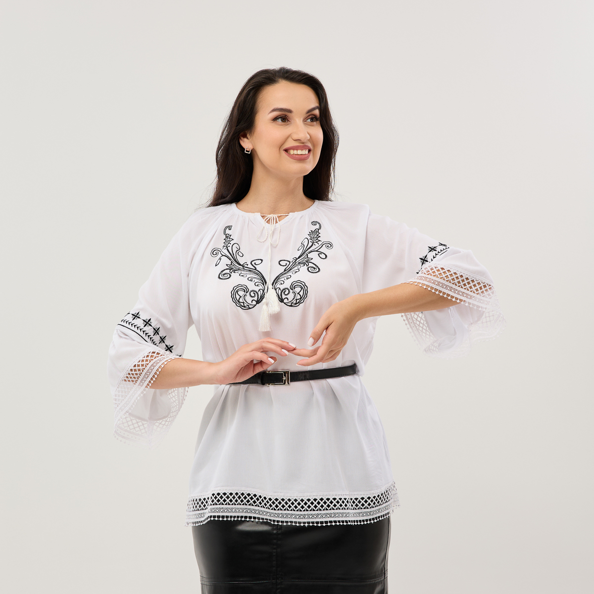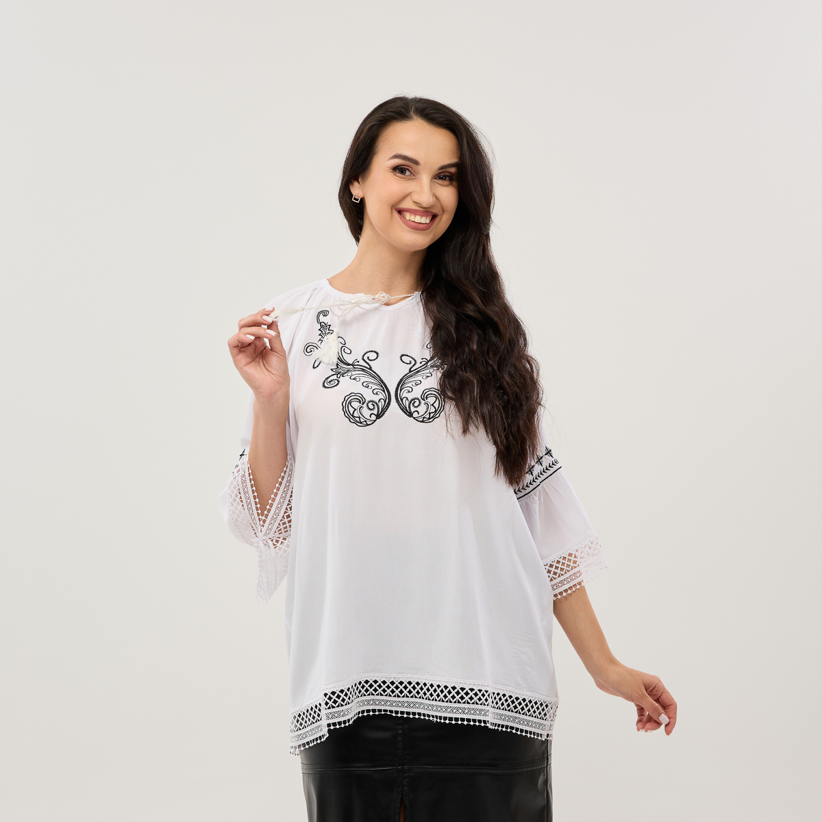 Прямий крій і довжина до середини стегна створюють зручний та вільний силует, що пасує різним типам фігури. Особливу увагу привертає витончений етнічний дизайн: справжня вишивка прикрашає портретну зону та рукави, додаючи образу глибини й автентичності. А ніжне мереживо по низу виробу та на манжетах рукавів підкреслює жіночність і додає елегантності.