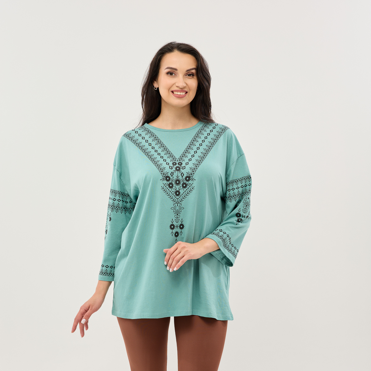 Особливу увагу привертає вишуканий принт у стилі вишивки, розташований на рукавах та в зоні декольте. Він гармонійно поєднує традиційні мотиви з сучасною естетикою, підкреслює індивідуальність і додає образу автентичного шарму. Завдяки широкій палітрі кольорів — від класичного білого й чорного до виразного бірюзового, насиченого помаранчевого та елегантного темно-синього — кожна жінка зможе підібрати свій ідеальний варіант.
