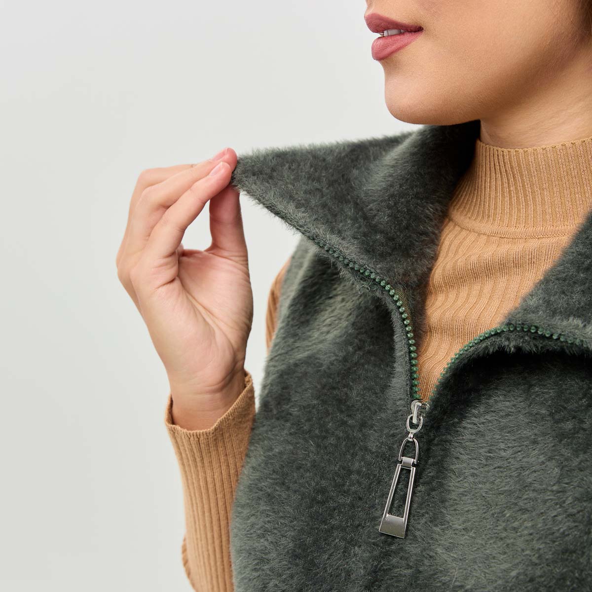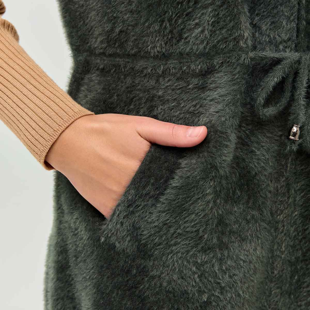 Крій: прямий. Коллекція жилетів з комірцем стійкою та капюшоном, м'яка та тепла приємна до тіла тканина, якісна фурнітура. Жилет зі стійкою має пояс для підкреслення талії, кишені. Жилет з капюшоном має нашивні кишені, затяжку на капюшоні.