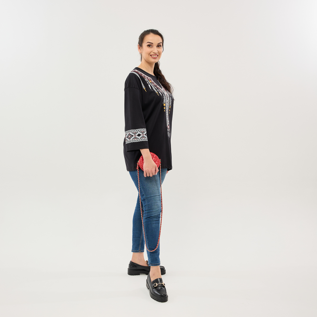 Особое внимание привлекает изысканный принт в стиле вышивки, расположенный на рукавах и в зоне декольте. Он гармонично сочетает традиционные мотивы с современной эстетикой, подчеркивает индивидуальность и придает образу аутентичного шарма. Благодаря широкой палитре цветов - от классического белого и черного до выразительного бирюзового, насыщенного оранжевого и элегантного темно-синего - каждая женщина сможет подобрать свой идеальный вариант.