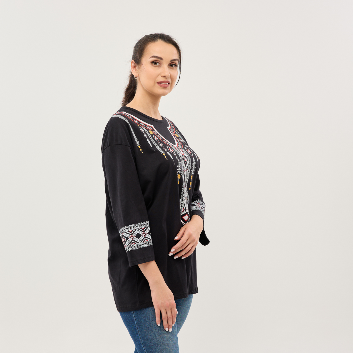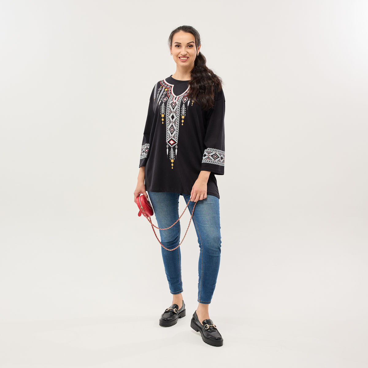 Блуза украшена оригинальным принтом в стиле вышивки, что гармонично вписывается в современные модные образы. Она подчеркивает национальную самобытность и вкус, оставаясь универсальной и актуальной для любого события.
