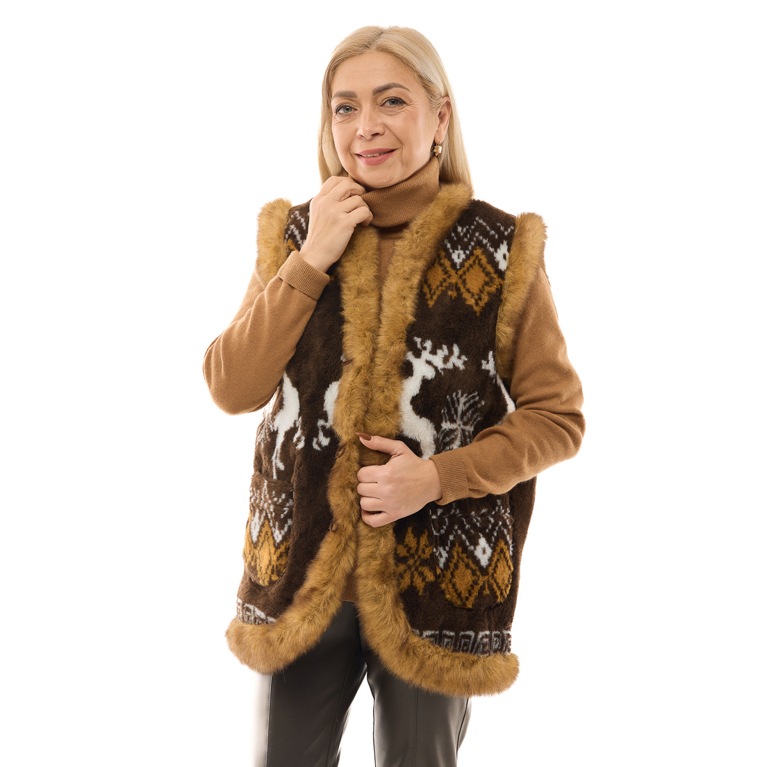 Дуже мені сподобався жилет, м'який, теплий, якісний, такий гарний малюнок. У ньому сміливо можна ходити по вулиці. Дуже красива, якісна жилетка і ціна відмінна. Я задоволена покупкою, спасибі. Всім рекомендую.